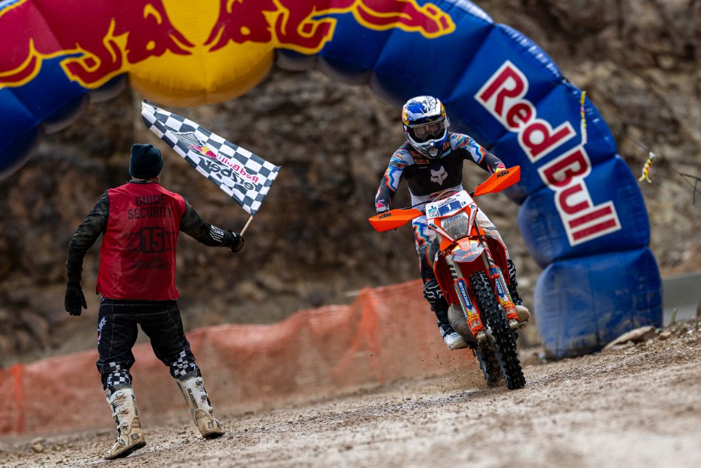 His lead was so impressive that he spent the last part of the race doing some wheelies for the audience. After 2h48m of racing, he bagged his third consecutive win at the Erzbergrodeo.