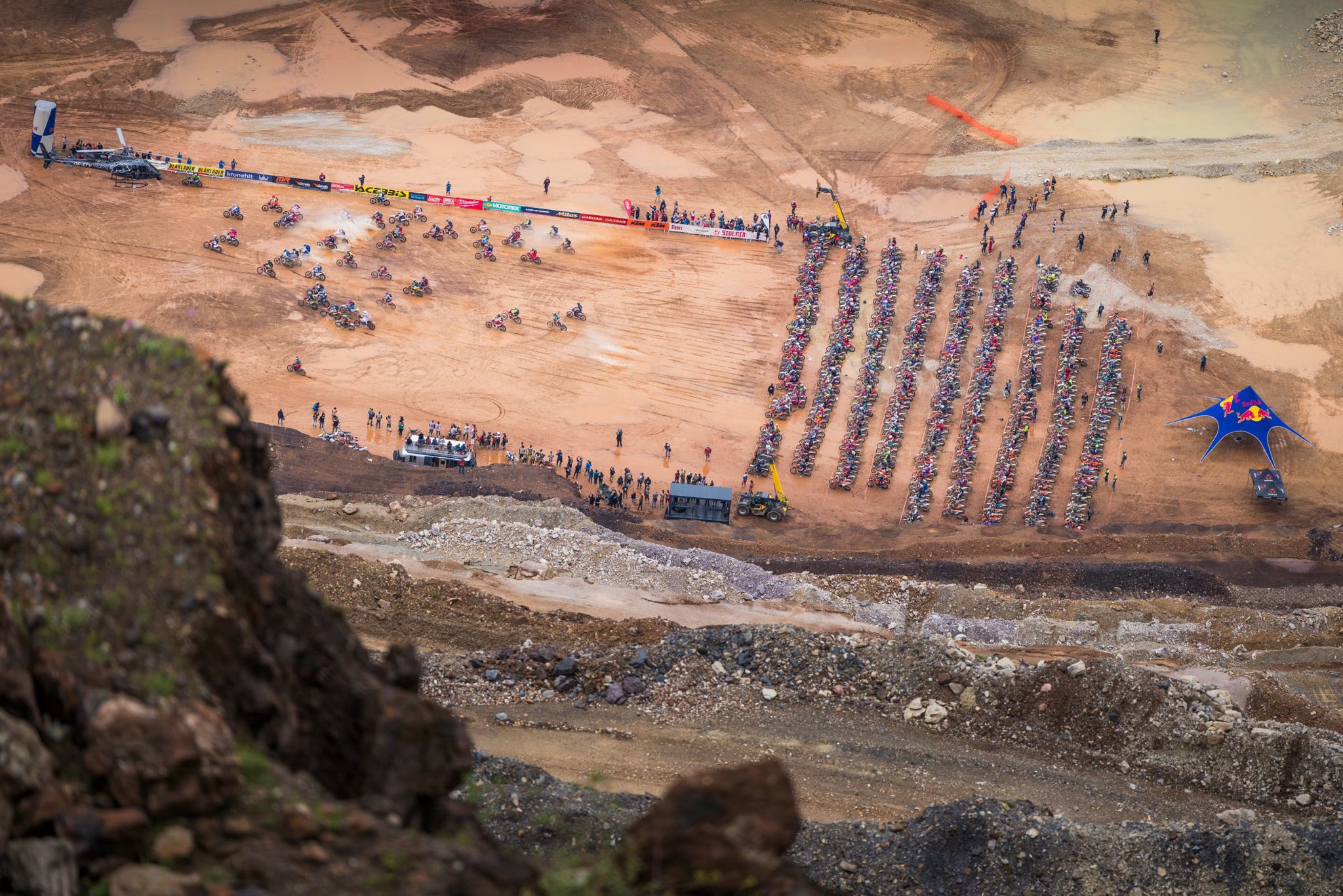At the start, Trystan Hart ran out of space and crashed into the big track marker at the end of the straight. Several riders ran over his bike, which left him in about 50th position among the five hundred riders that qualified for the Sunday final. He was bruised, but quickly got back on his KTM and fought his way up.