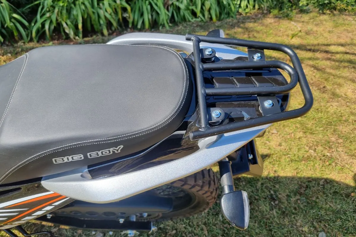 The bike is a solid performer. When you close the throttle hard, the engine produces a dlekker little popping sound from the exhaust which both Deon and Kyle like a lot. The TSR250 comes with a handy carrier rack. This feature is perfect for carrying extra gear or mounting a top box.