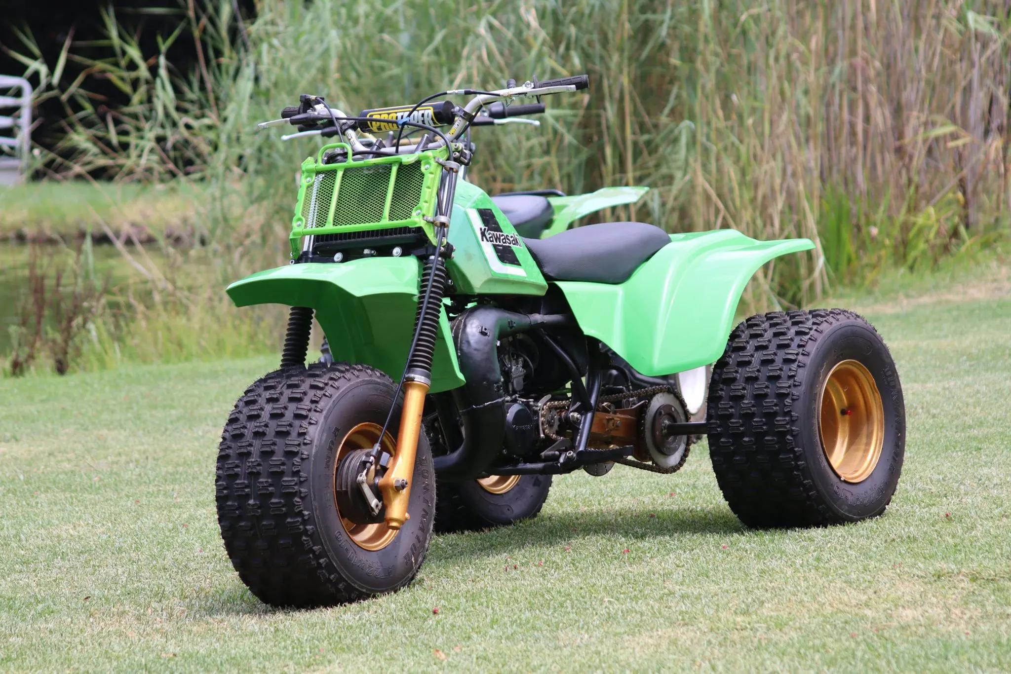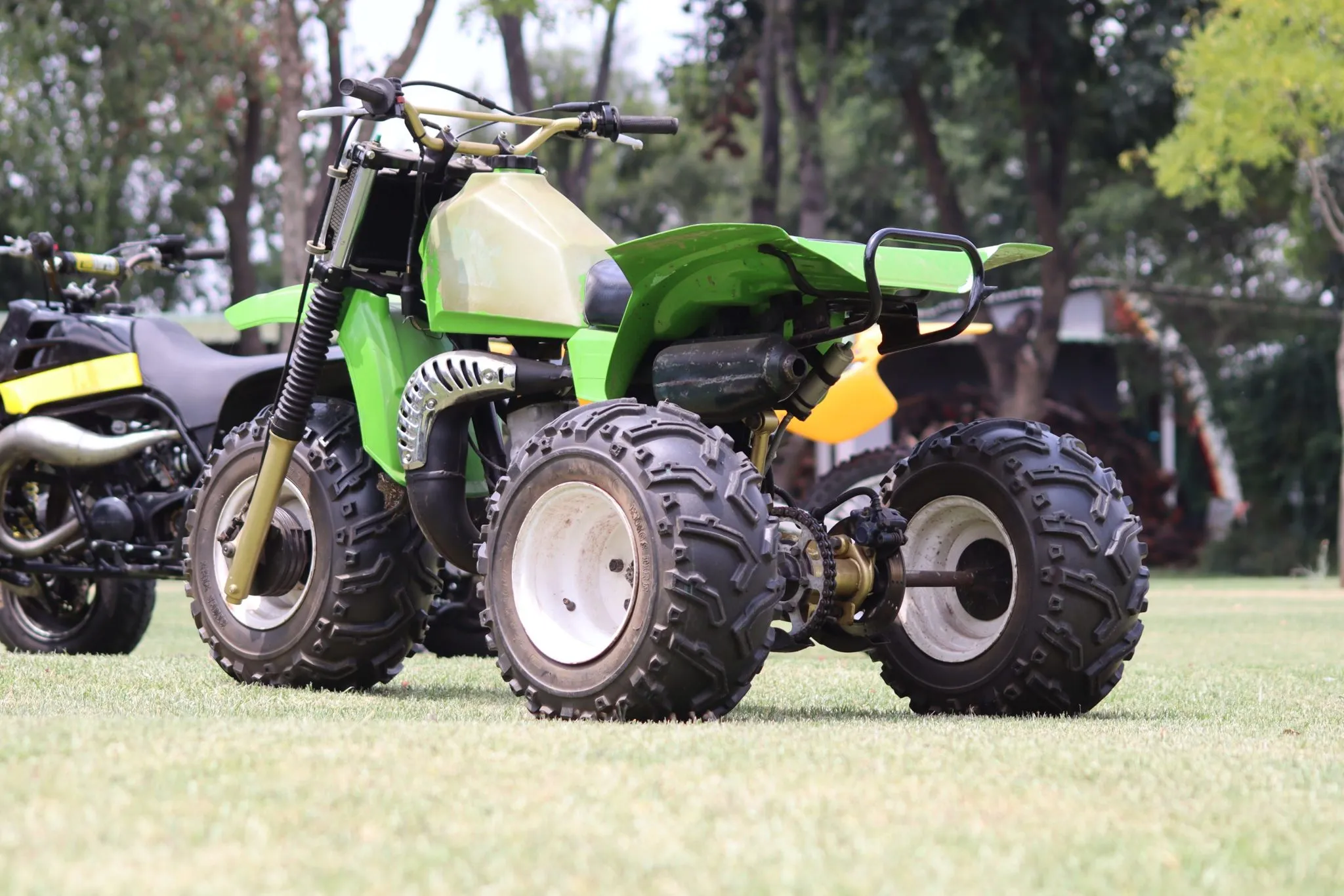 Seeing that the ban on 3 wheelers was because they were deemed too dangerous, you might think only crazy people will still have one in running condition, well Ty owns three. He also has two 1984 Kawasaki KXT250 Tecate ATV’s. Kawasaki’s answer to the Honda’s ATC 250R as competition. The KXT250 has a much wider front wheel than any other three wheeler I have ever seen. One of these bikes Ty bought as is and just did the bare minimum to get it running again, you can see this one had been used quite a bit as even the paint on the tank is faded. The other one Ty found in pieces and had to rebuild it, and he did an excellent job to get it to look and run the way it does now. Even the cylinder had some strange and weird engraving on it. Now that engine looks almost like it just came out of the factory.