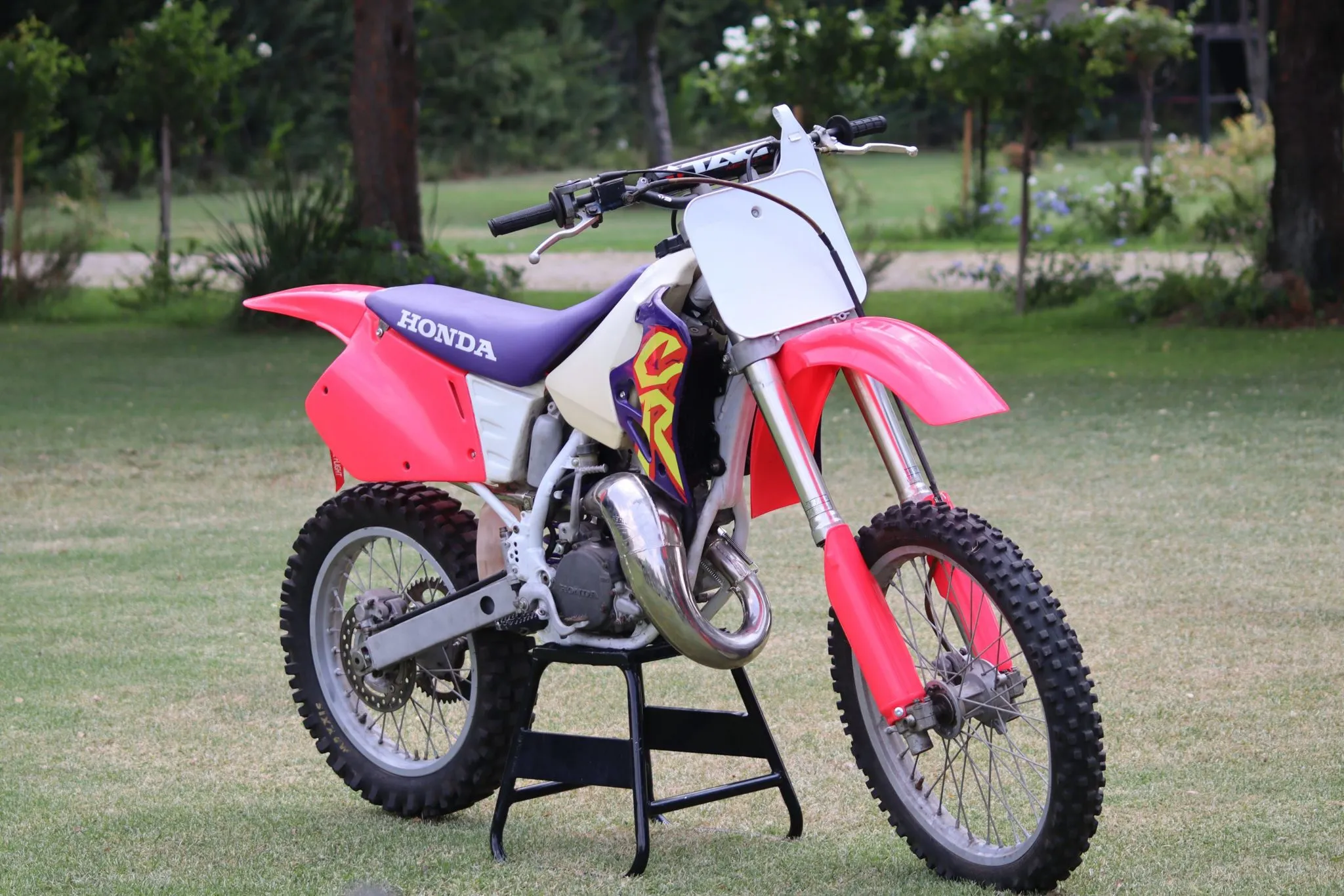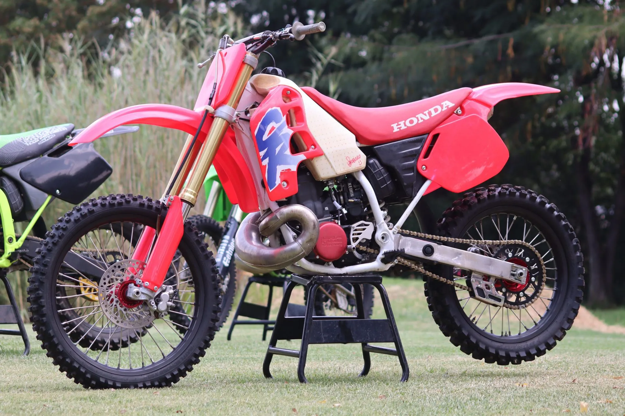 Ty also showed us his 1995 Honda CR125, a partially restored motorcycle with a few new plastics making it look almost race ready. Sticking with the original colours red and purple (Uranus Violet) with the white frame and bold CR logo. He even kept the rear spring purple. This beauty with its shiny FMF Gold Series Fatty pipe makes one feel that you just want to jump on and kick it to life just to hear that sound and get a whiff of that 2-stroke awesomeness.