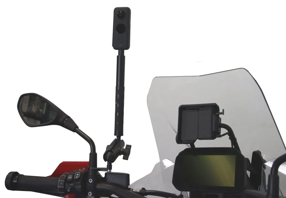 Among the clamps is a double-sided one used to brace the selfie stick. The stick screws into the usual clamp while this second clamp mounts somewhere else on the bike and onto the part of the stick making it far more stable, allowing greater extension.