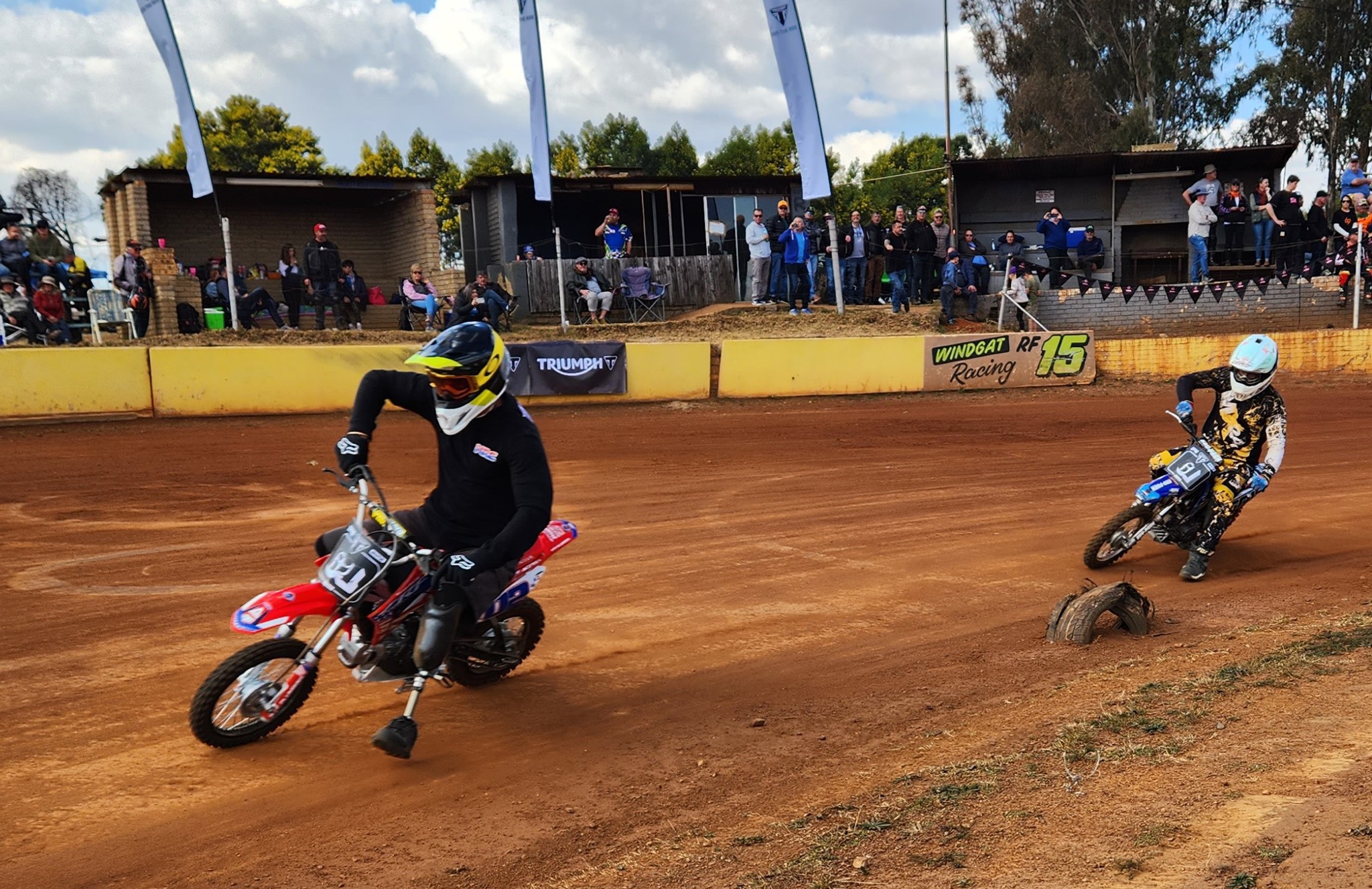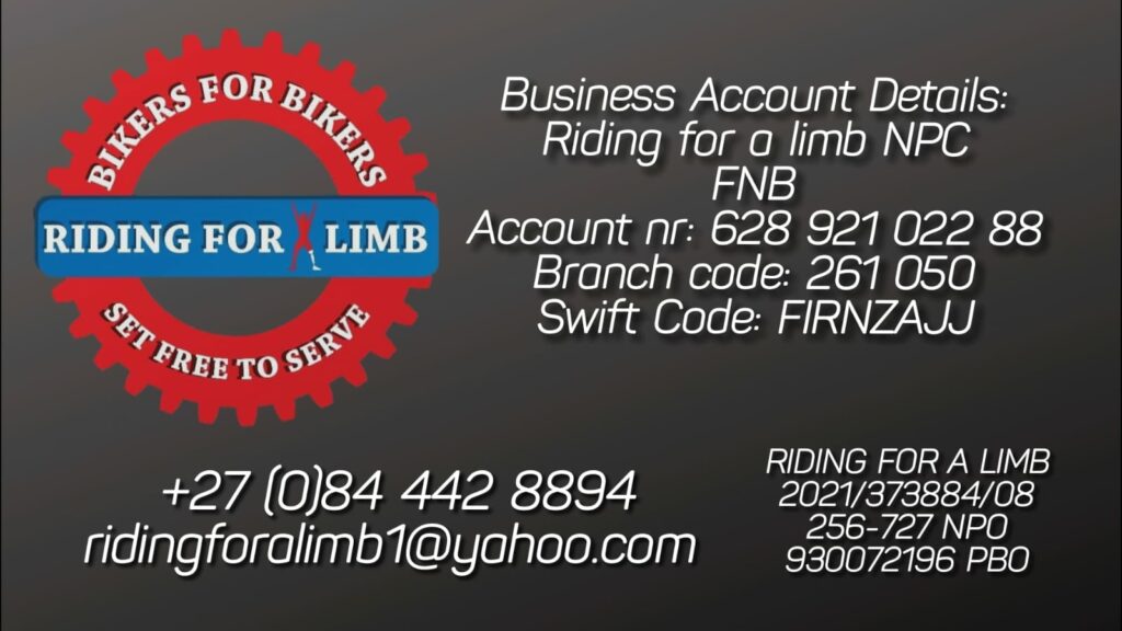 His good mate Paul put him in touch with Gerda and Charl – he received a prosthetic leg and guess what? He races pit bikes, helps with Riding For A Limb, inspires riders and leads a normal life.