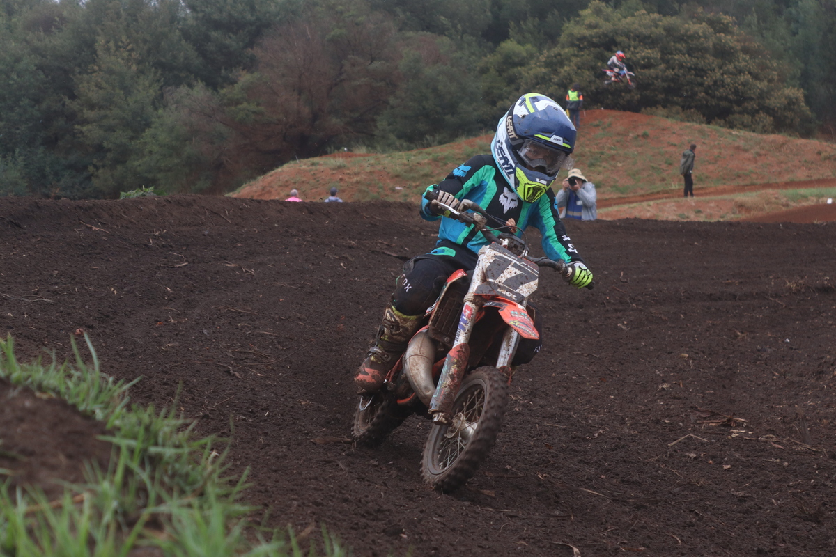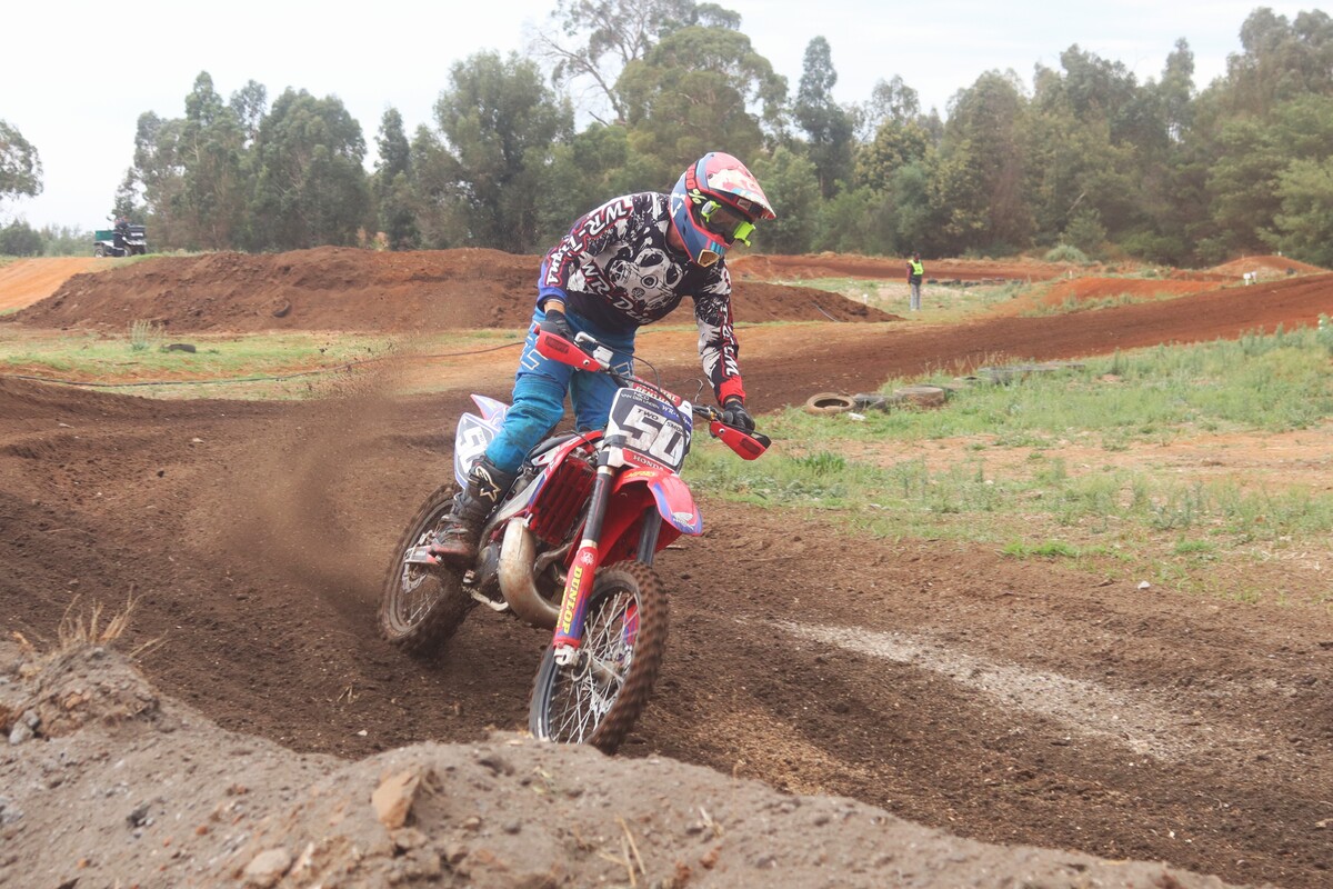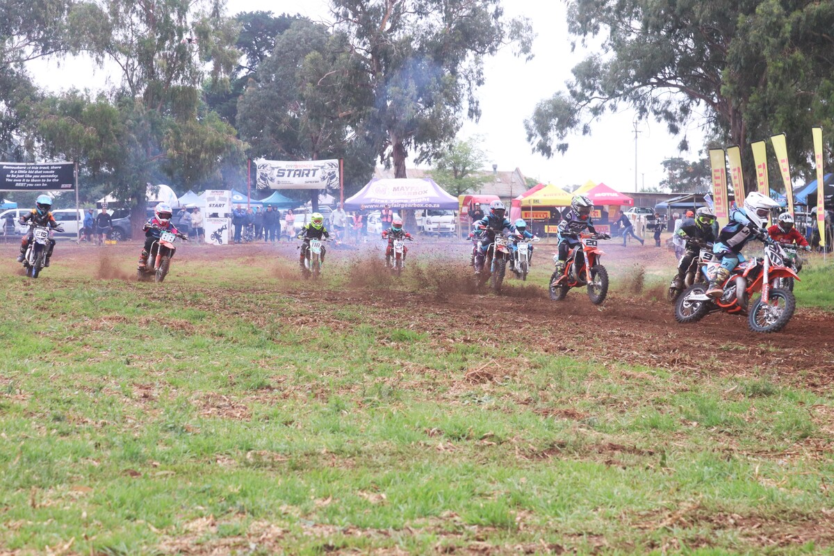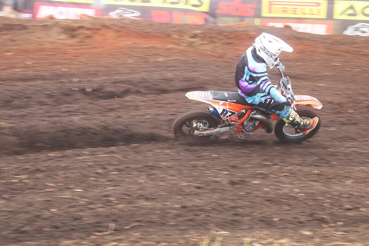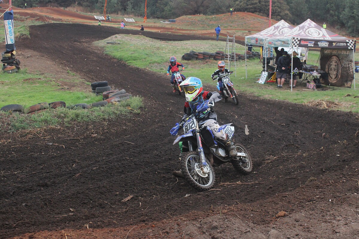 MX 50cc JNR & 50cc SNR. 50cc JNR Heat 1. The juniors lined up alongside the senior riders, the gate dropped, and the race was on. #8 Paul Graven set a strong pace from the start and rode his way to 1st place. #18 Garry Hamer took 2nd, followed by #112 Logan Fulton in 3rd. Heat 2. This time around, Fulton had a much better run, outpacing his competitors to claim the win. Coming through in 2nd was Hamer, and #14 Milan le Roux finished 3rd.