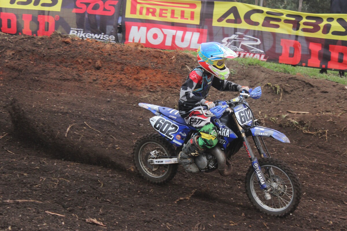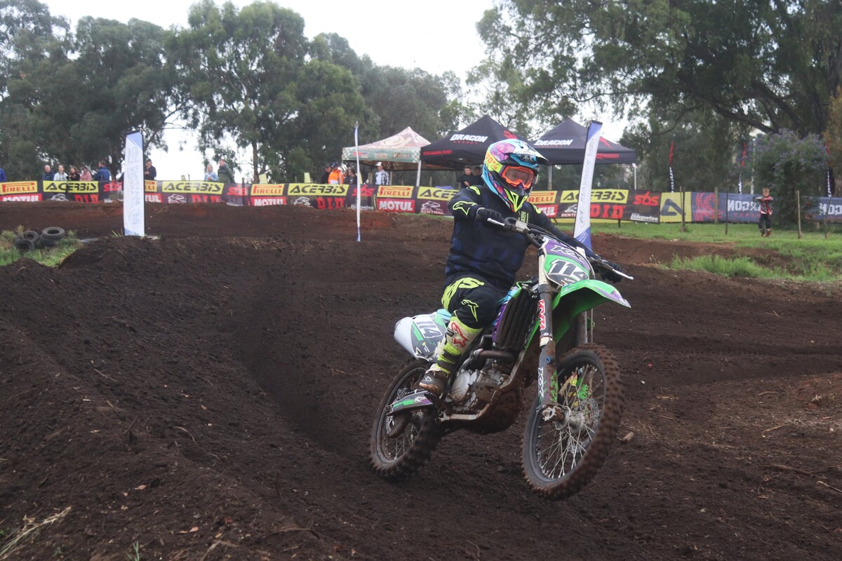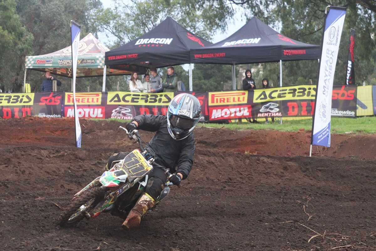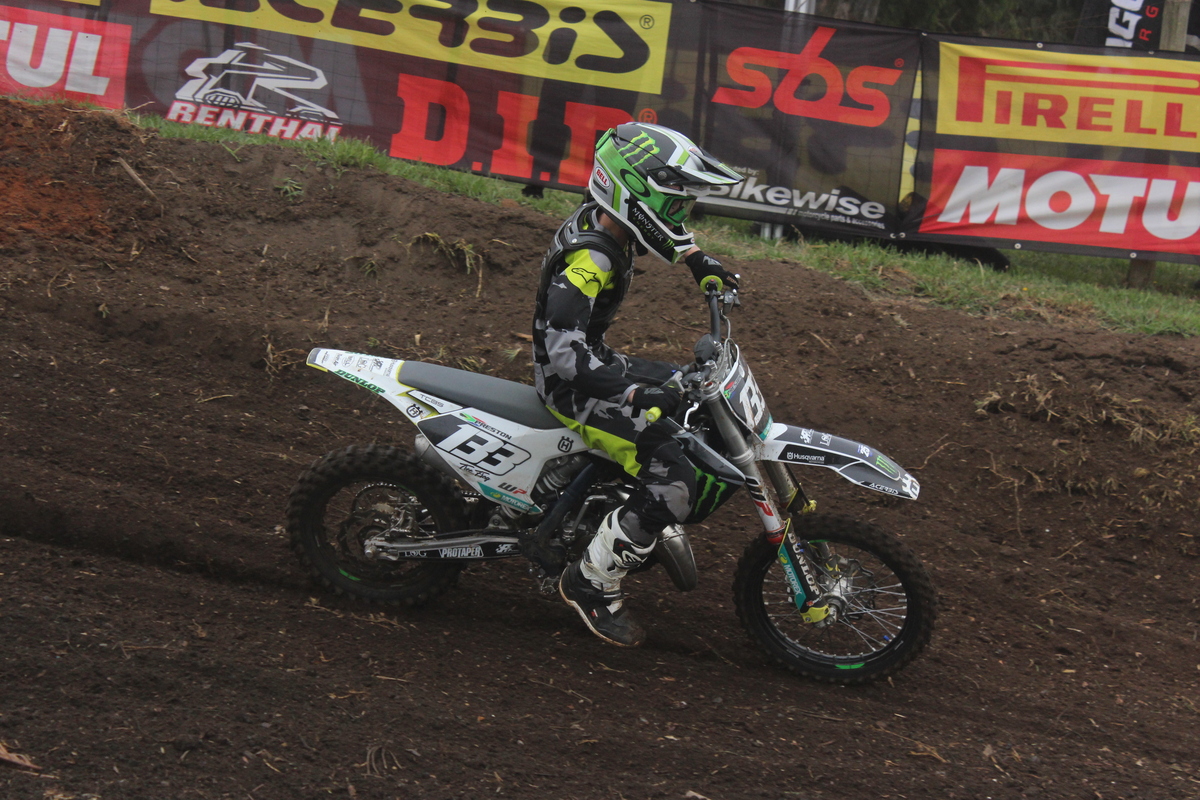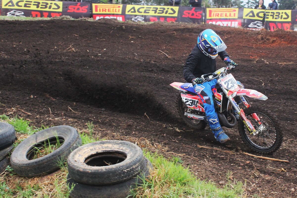 MX85cc JNR & Pro. 85cc JNR. Heat 1. The 85cc 2-stroke engines roared into life. It didn’t take long for #133 Deagan Preston to take the lead. He held the front and took the win. #413 Rocco Kapp finished 2nd, followed by #23 Gennaro Zabotto in 3rd. Heat 2. Preston was in a league of his own, dominating once again to secure 1st overall. #602 Rogan Schwim showed a much-improved pace to finish 2nd, with Kapp in 3rd.