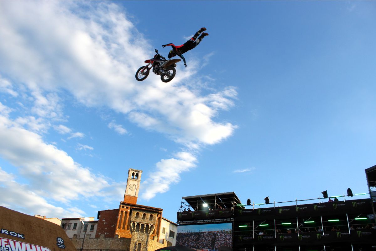 A ‘whip’ in Freestyle Motocross refers to a mid air trick where the obviously crazy riders flick their bikes sideways and even backwards while doing everything they can do to almost fall off, while aiming to land without actually falling off.