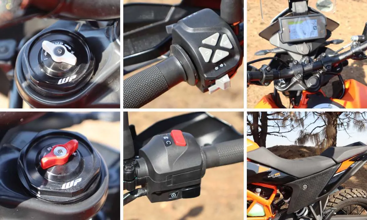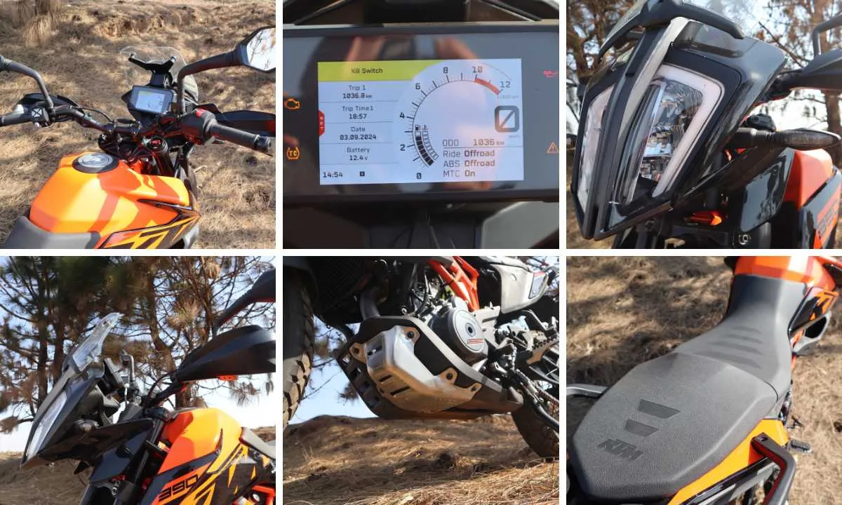 The latest version of this 390 adv shares the same platform and electronics package as its 390 Duke sibling, meaning that it now has the offset rear shock and the trellis frame with an ally sub-frame, which all results in better ground clearance and keeps the seat height fairly low, even with the long travel WP Apex adjustable suspension front and rear. Other niceties include a Bluetooth connectable screen for calls and navigation as well as switchable rider modes on the fly. Traction control and ABS can be switched to “Off-Road” mode, ABS is on the fly but you do have to be stationary to switch that and both systems are lean angle sensitive. A quick-shifter mated to the 6-speed box is a standard feature as are LED lights all around.
