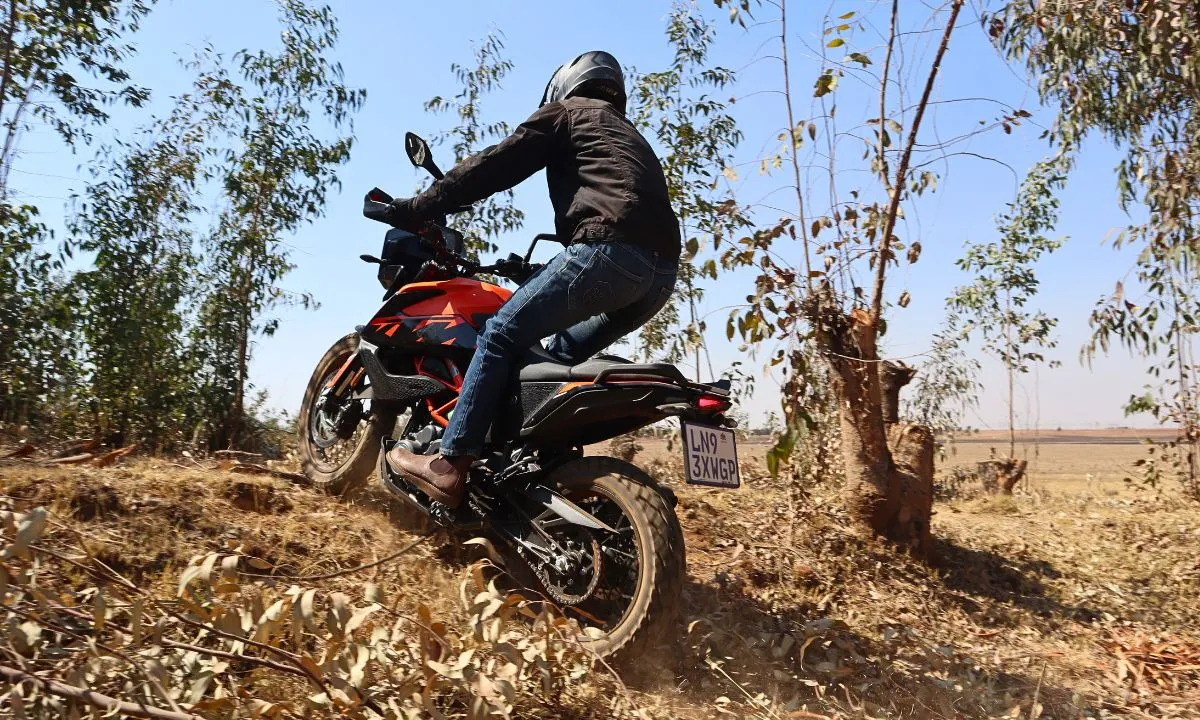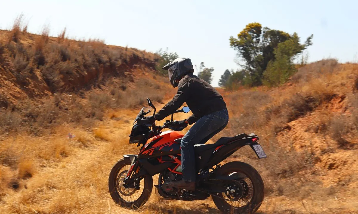 However, it’s when I got into the dirt that the 390 Adv really came alive. My buddy and I followed the trails from just behind our house, sneaking onto farmers lands here and there when we spied interesting obstacles to play on. Hitting jumps and dropping into donga’s at speed with my 80kg, 1.85m chassis on board, not once did the suspension drop through its stroke on either the front or rear – and I wasn’t being gentle on it either. It soaked everything so well and the rebound was smooth and predictable all the time. It’s not a dirtbike, but man it’s so capable and easy to fling about. Through all of that I didn’t bang the bash plate on middle mannetjies, rocks or anything else, so ground clearance is excellent.