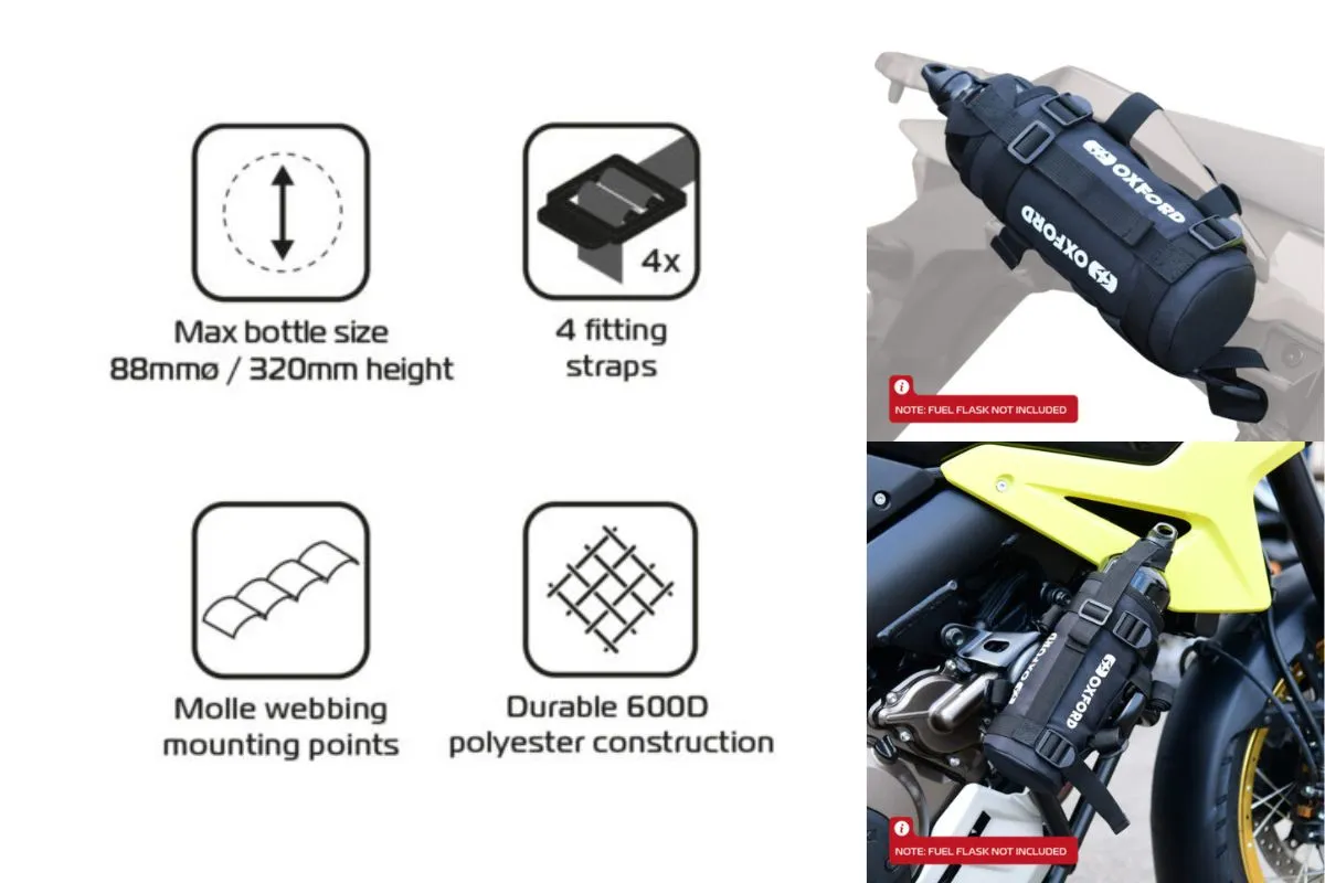And, they have really thought this through properly, the Tool Caddy is designed to fit snugly into the Oxford Bottle Stash which is an adjustable drinks and fuel bottle carrier designed to fit Oxford Fuel flask 1.5L & 1.0L and the Oxford Insulated Drinks Bottle 1.0L or your regular thermos of hot coffee in our opinion. And, best of all it is exceptionally easy to mount safely onto your pillion grab handles, your bikes crash bars, anywhere you feel is safe and easily accessible.Â