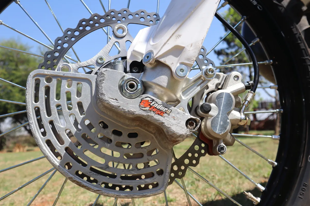The bike we rode has some protective goodies fitted by Shimwells, Enduro Engineering disc and fork protectors, a carbon fibre pipe guard and swingarm guards.