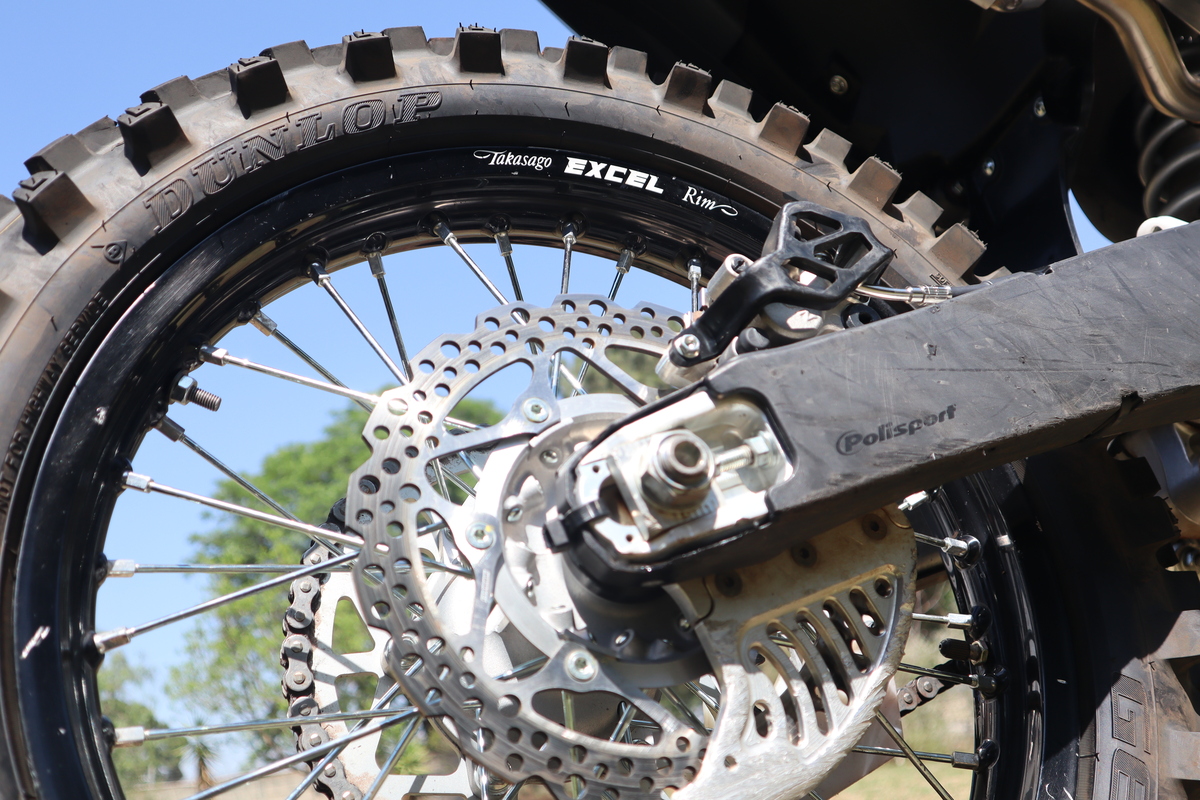 The bike we rode has some protective goodies fitted by Shimwells, Enduro Engineering disc and fork protectors, a carbon fibre pipe guard and swingarm guards.