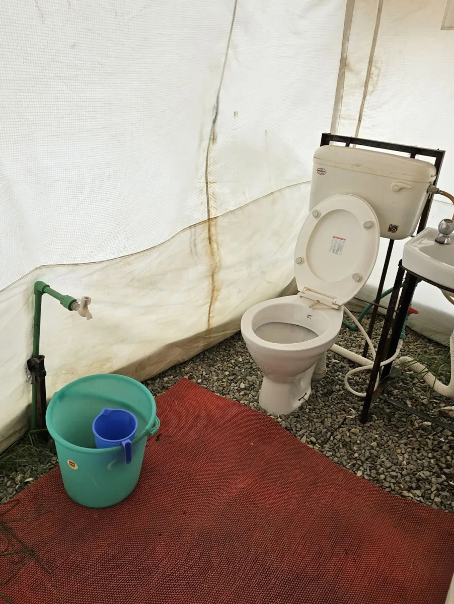 Accomodation is varied, but always clean and neat. The loo and shower setup in the lux swiss tents is fun... nothing is bolted down, so balance is a critical skill...