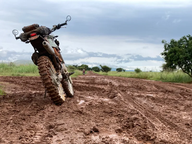 The moment we hit the next dirt road at Laersdrif, we were in for a huge surprise! We encountered just mud, mud and more thick soppy mud for the rest of the road all the way to Dullstroom! Surprisingly it was less difficult than it initially appeared and then the two small bikes happily cruised along through the mud and deep puddles at a steady pace. Halfway through this ominous stretch, we came across a biker couple on a KTM 690 and KTM 390, who were desperately looking for the nearest bail out road! After having a quick friendly chat we left and in my rear view mirror I could see how they jealously glanced after the two light weight bikes cruising effortlessly through the mud! I would love to know what time they reached Dullstroom as by now the sun already started to cast long shadows.