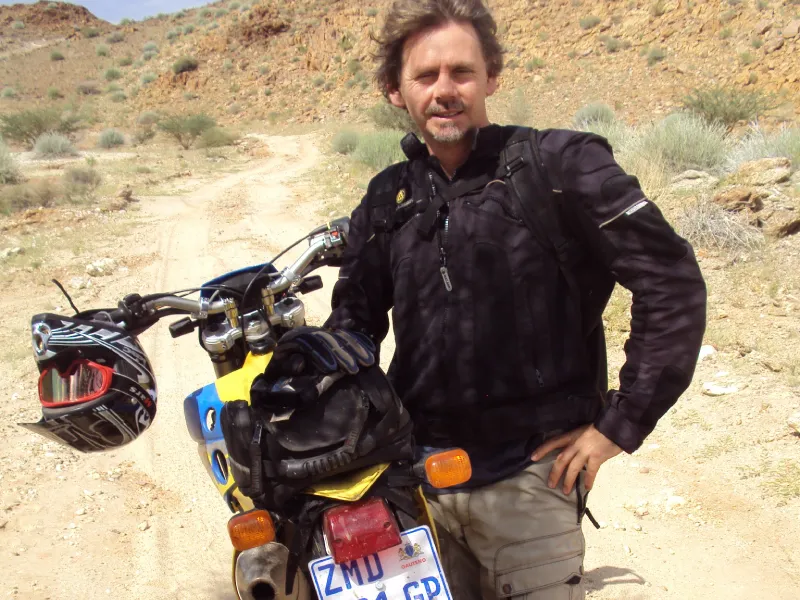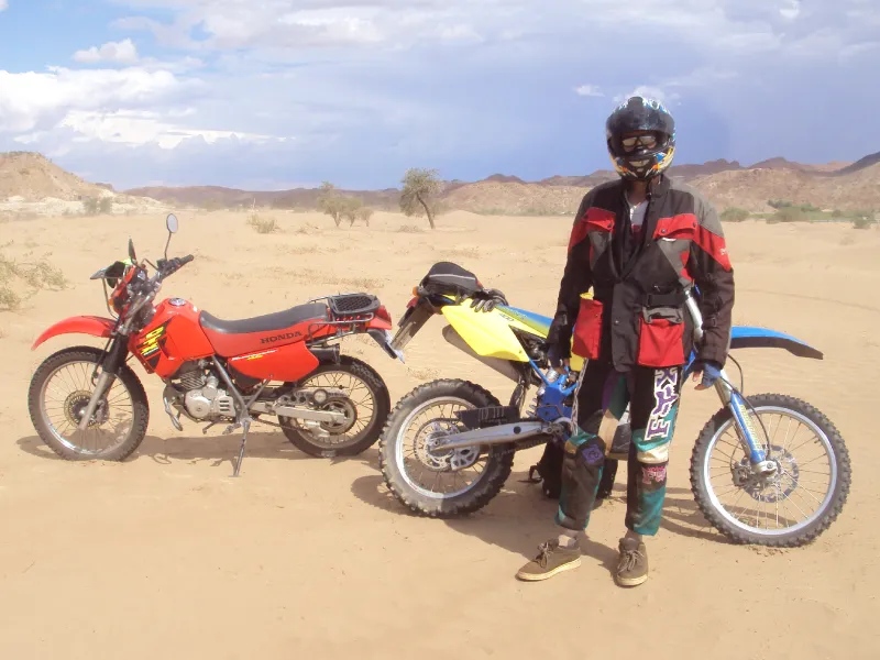 Photo credit: Chris Wilkinson – Gustav and I near Riemvasmaak in 2011, with a Honda CTX200 farm bike and a Husaberg 400.