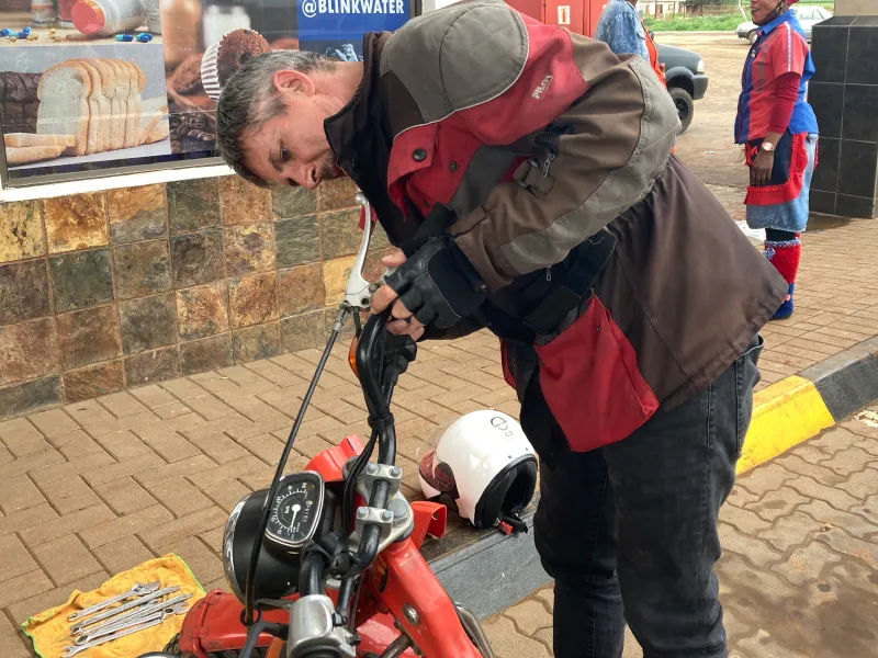 Photo credit: Chris Wilkinson – Roadside repairs of a broken throttle cable.