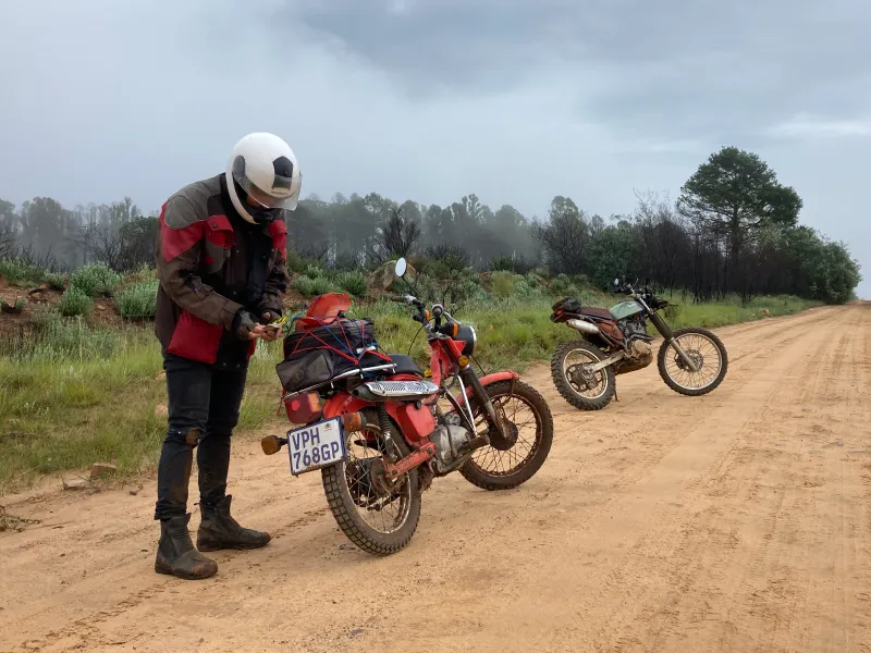 It was during Lockdown 2020, when we first started discussing a possible trip somewhere on very small and unique motorcycles. Gustav owns a 1980’s CT 110 (Postie) and I converted a 2003 Honda CRF 230 into a custom scrambler a few years ago. The trip was planned and postponed many times, but we eventually concluded it must be a dirt road trip from Pretoria to Dullstroom. Bearing in mind every trip planned with Gustav, you never know if the trip will actually happen, until you are actually on the bike, leaving town. With very little packing space, it was a lot of this way and that way of who is taking what, so tools could be shared etc.