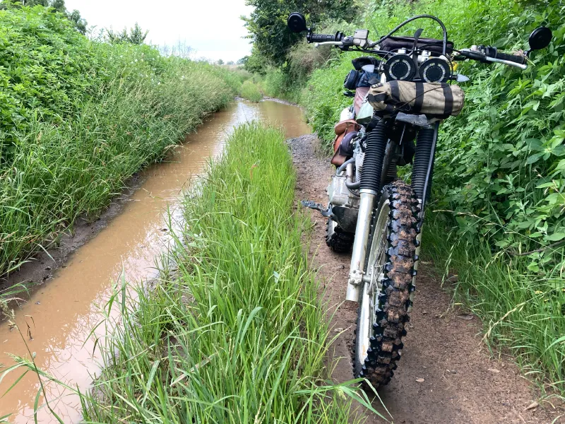 Our route started through the suburbs, avoiding all major roads, and heading for the first dirt road turn-off from the Cullinan road towards Rayton. A relaxed feeling came over us when we hit the dirt roads as it meant cop free zone. Crossing over through traffic in Rayton was easy and then we jumped onto a railway service road, which leads almost all the way to Bronkhorstspruit. On this section we encountered our first rather deep, water crossing. It started raining and at this point my (heavily loaded) reliable CRF230 started missing beats for some reason, mostly in top gear. Entering Bronkhorstspruit was nerve wracking as we were not only in cop zone again, but also hectic traffic and avoiding lots of taxis. At this point in time we were already soaking wet and I discovered my raincoat zip was missing and I had to make do with a kayak vest I had luckily packed as well.