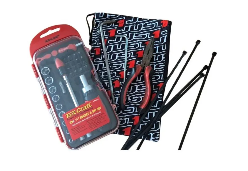 It’s most of the stuff that you need for the trail, with a magnetic Tee handle and adaptor, Hex, Phillips and flat drivers, most common sockets (from 4ml to 12 ml) and a soft grip ratchet screwdriver (But we left that at home, coz the T bar works perfectly.)